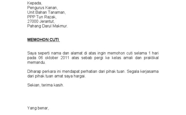Jika mahu cuti panjang, tetapi tidak ada idea untuk beritahu boss, boleh cuba ikuti contoh surat cuti tanpa gaji dari kami berserta beberapa alasan yang . Contoh surat cuti kerja dari majikan have a graphic associated with the . (tarikh pekerja memberi maklumbalas terpulang kepada majikan tentukan)].